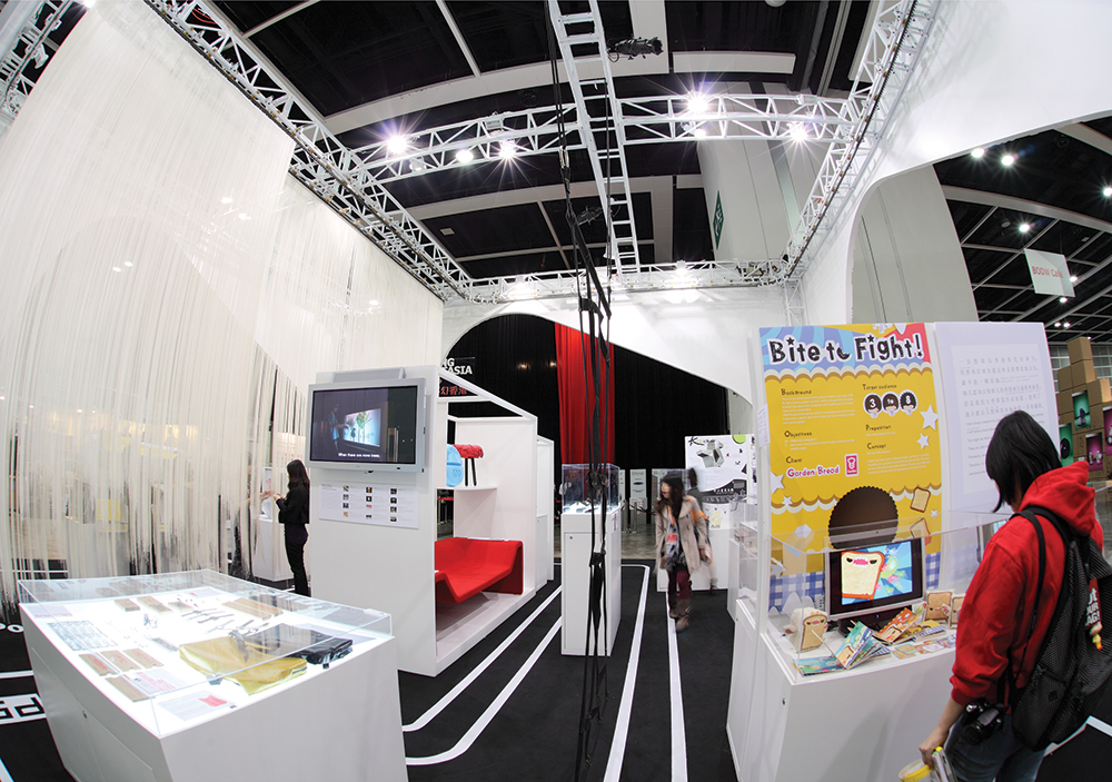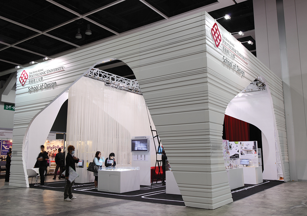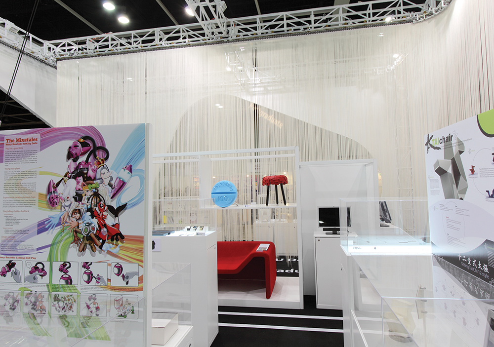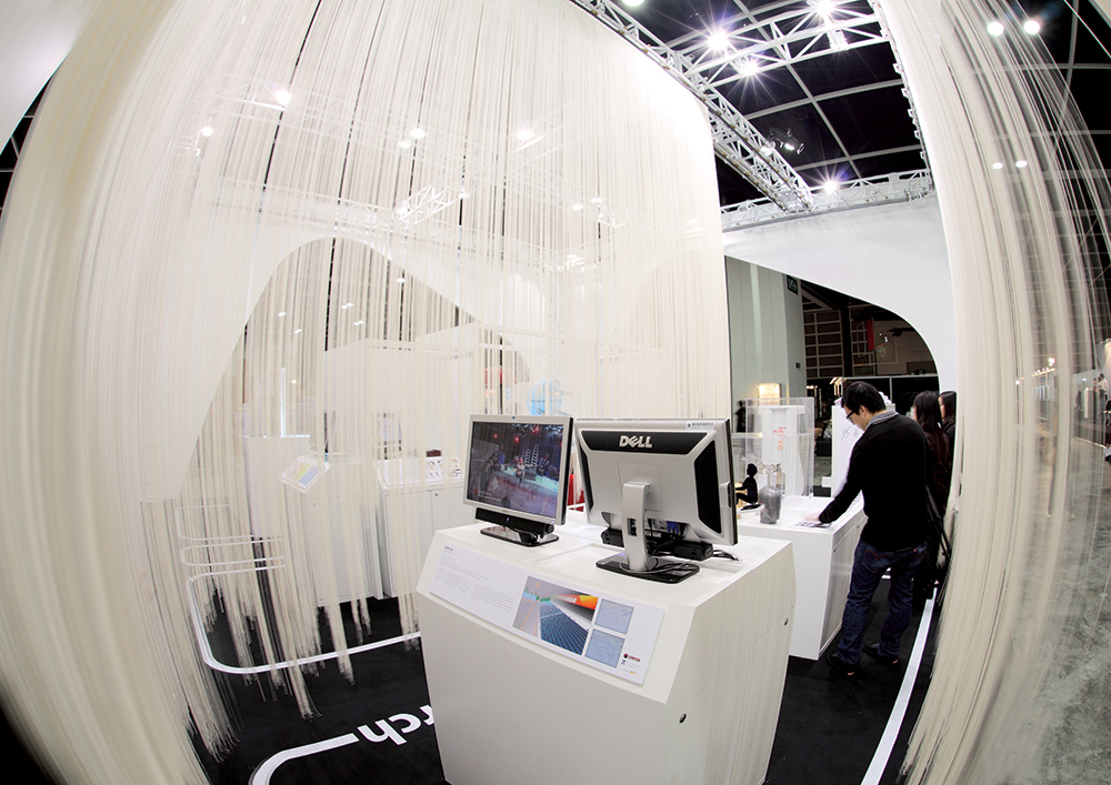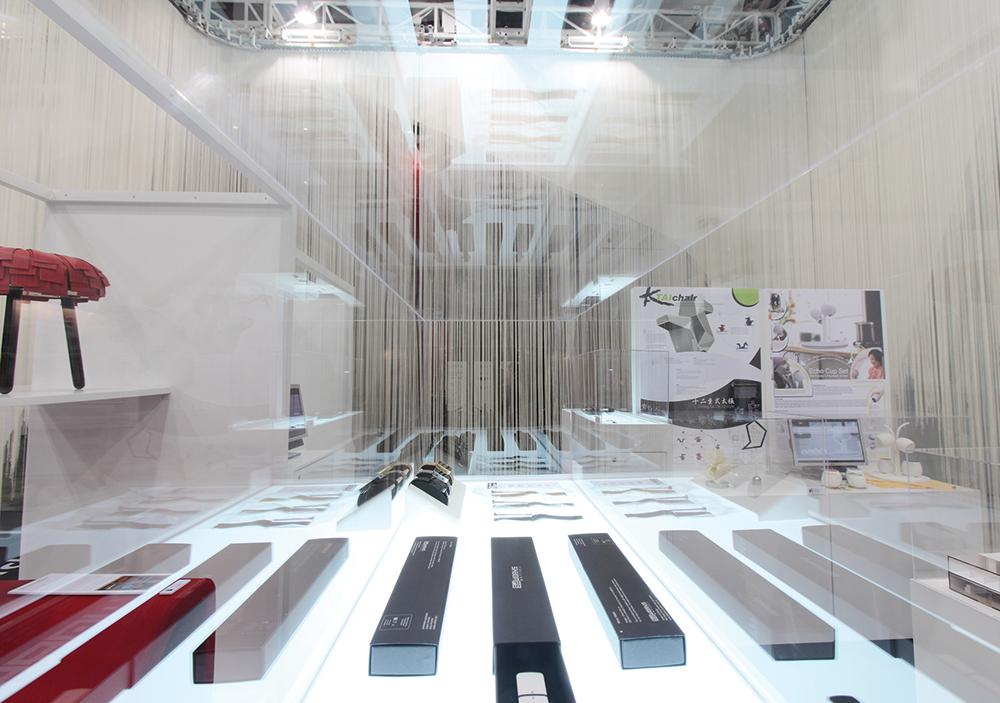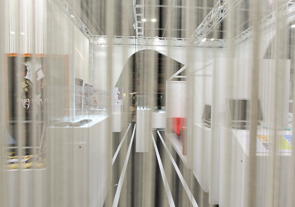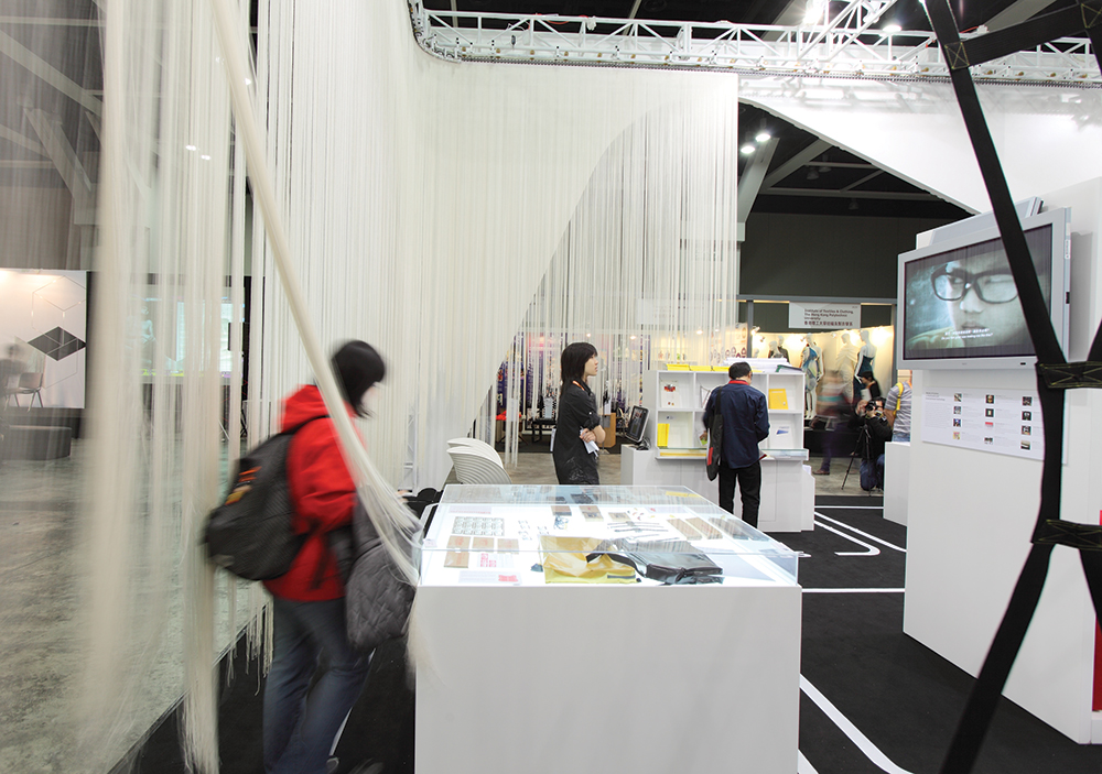 The idea was to create an intriguing space that changes incessantly by means of a moving curtain to heighten viewers’ interest in the exhibits — the work of young design graduates of the School. The moving curtain running on electrical railings created a space that is constantly being configured with the changing position of the curtain, making for a highly individualised experience because each visitor’s impression of the exhibition and viewing sequence of the exhibits is unique. Visitors were also captivated by the optical illusions formed by patterns produced by the moving strings. It was in such an intriguing spatial context and with a heightened sense of mystery and adventure that visitors discovered the burgeoning creative talents of the graduates.