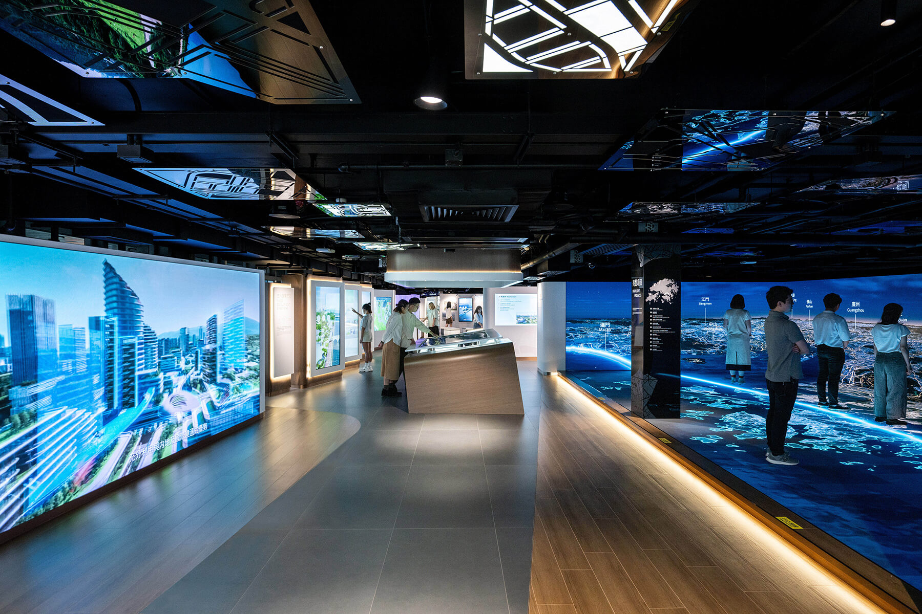 A stunning 270° LED dynamic tracking screen provides an immersive view of Hong Kong’s extensive urban planning. As visitors walk over a mapped floor, relevant areas pop up on the screen with detailed project videos, deepening their understanding of the city’s future transformations.