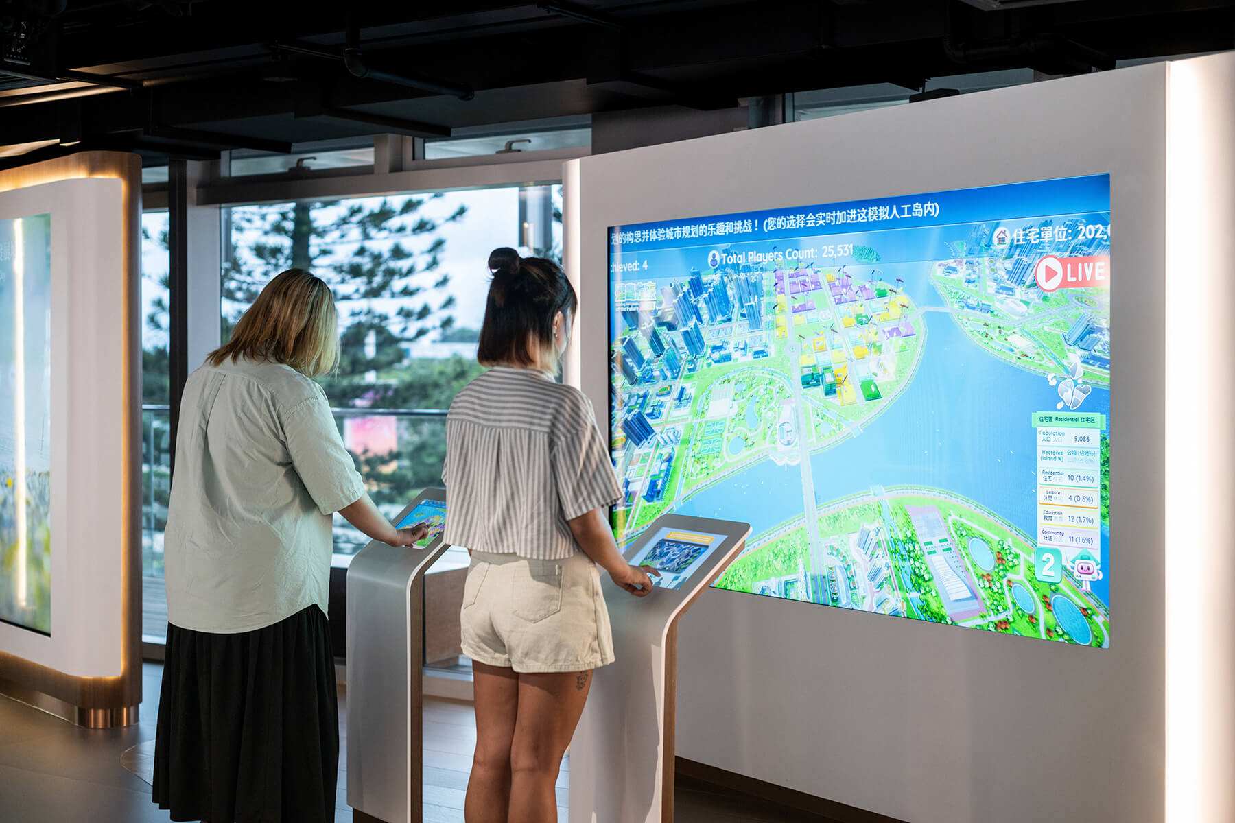 The exhibit “Flying over the Northern Metropolis” allows visitors to control a virtual drone, gaining an aerial perspective and to view through an urban planner’s lens. The KYCAI game allows visitors to design towns on tablets, contributing to a collective city model on the screen, merging education with interactive technology.