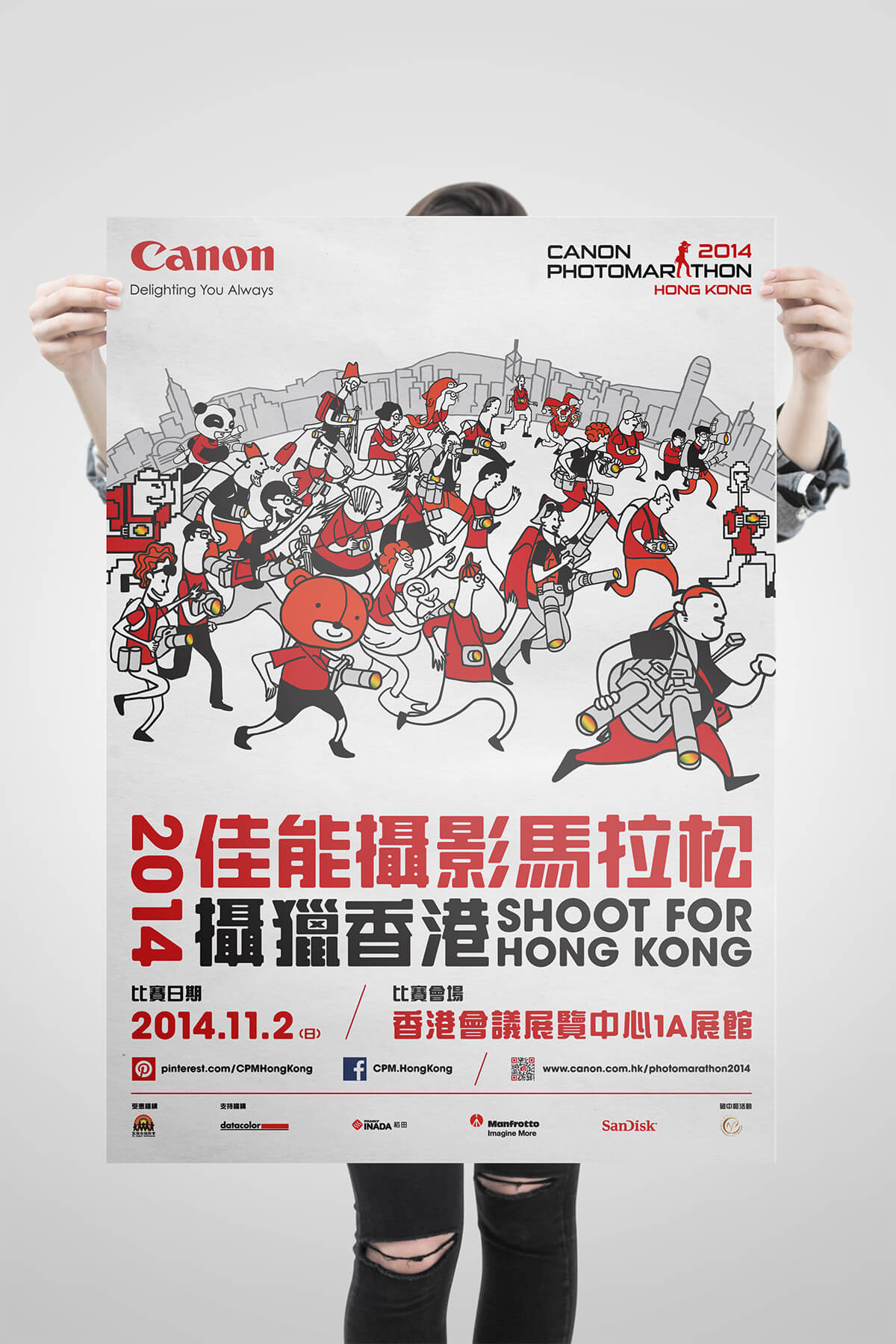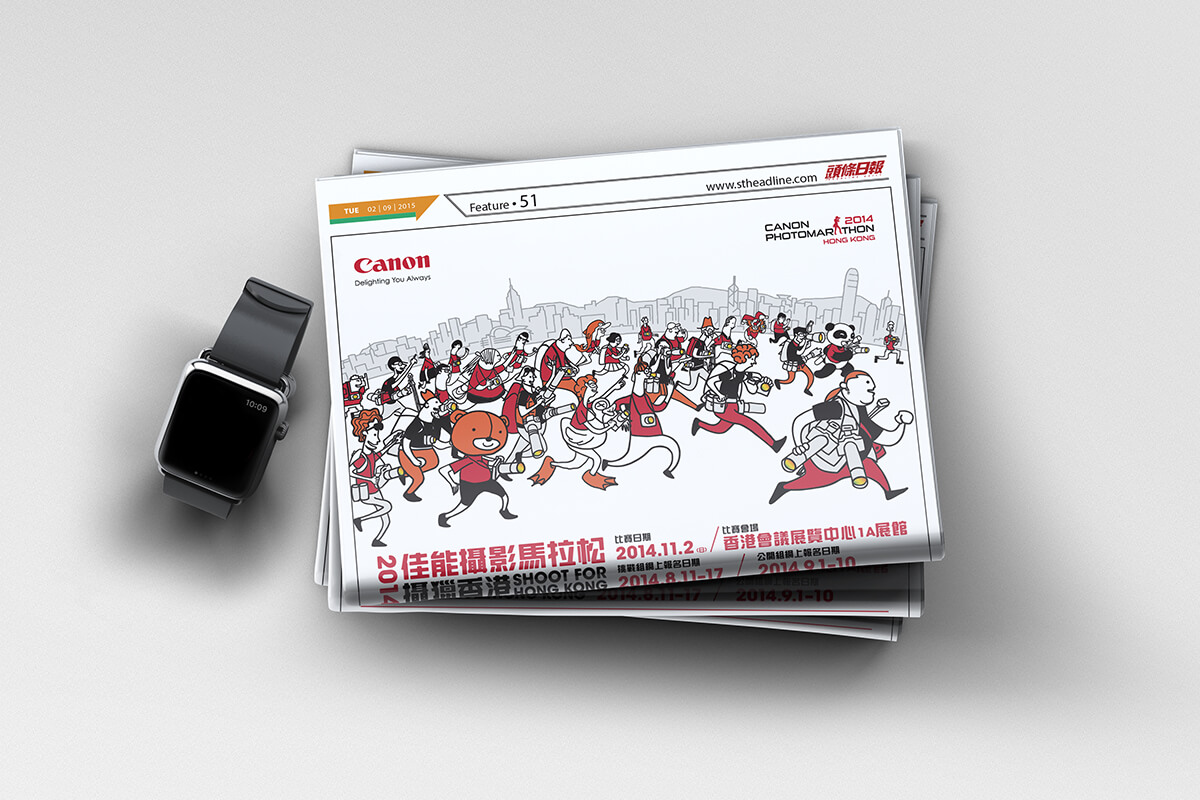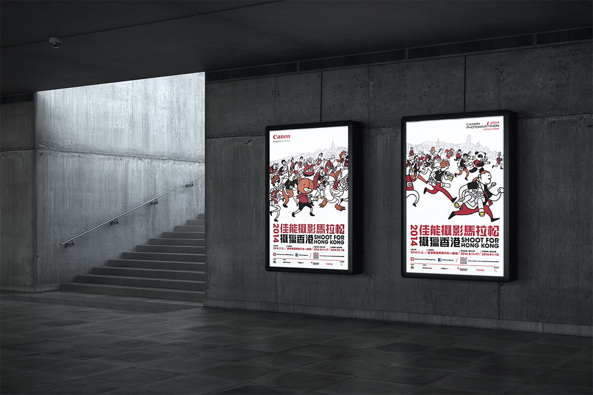 Canon PhotoMarathon is a photographic competition available in most parts of Asia. A playful and energetic approach is taken to echo with the competition theme “Shoot for Hong Kong”. Using bold outline and pop colours, the key visual illustrated a group of characters armed with cameras spreading out under the Hong Kong skyline to complete a series of photographic missions. These characters represented three different categories — with animal mascots for Challenge contestants, cartoon characters for Open contestants and pixelated characters for Online contestants.