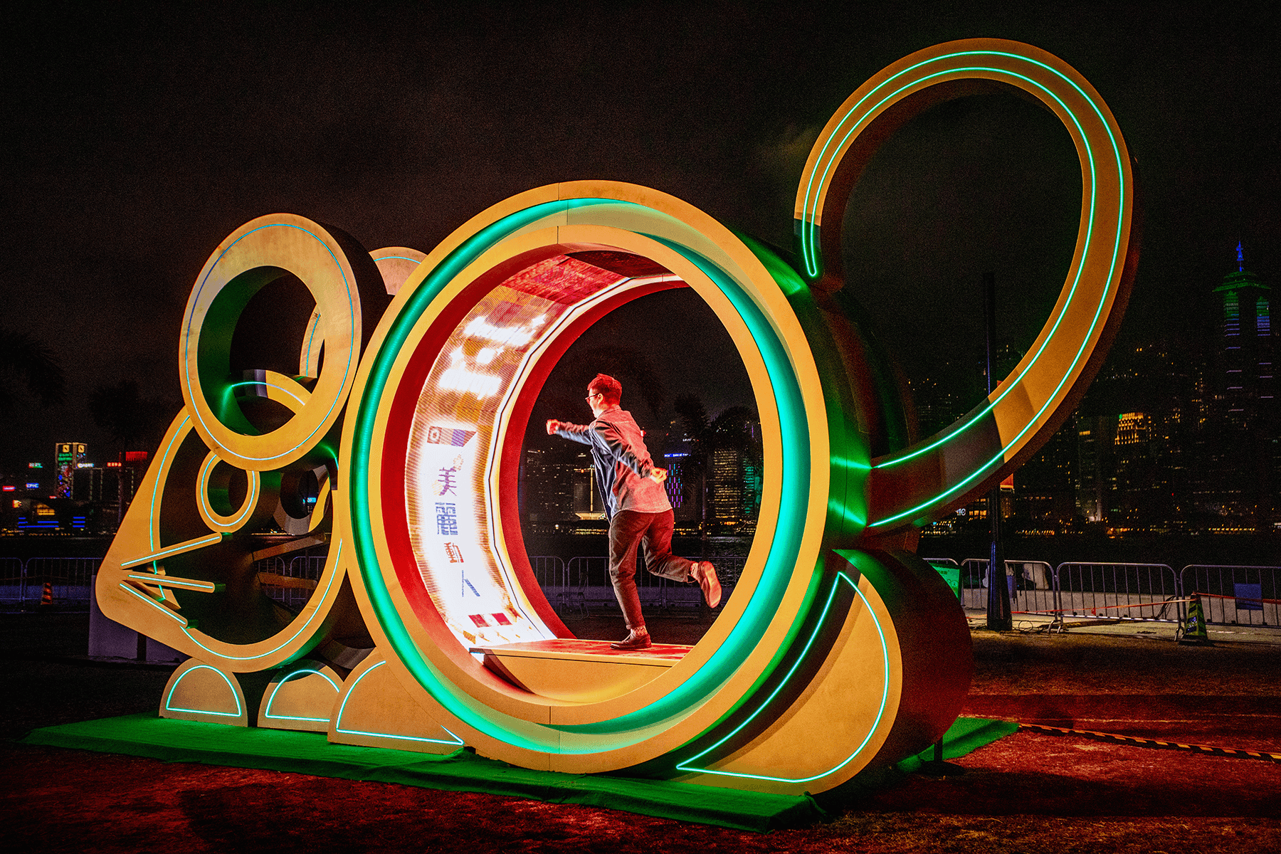 To celebrate the Year of the Rat, we created a golden rat interactive sculpture. Inspired by the rat wheel, visitors were invited to run inside the wheel to activate the interactive game. Greetings would roll along the circular LED screen synchronised with the running speed of the visitor.