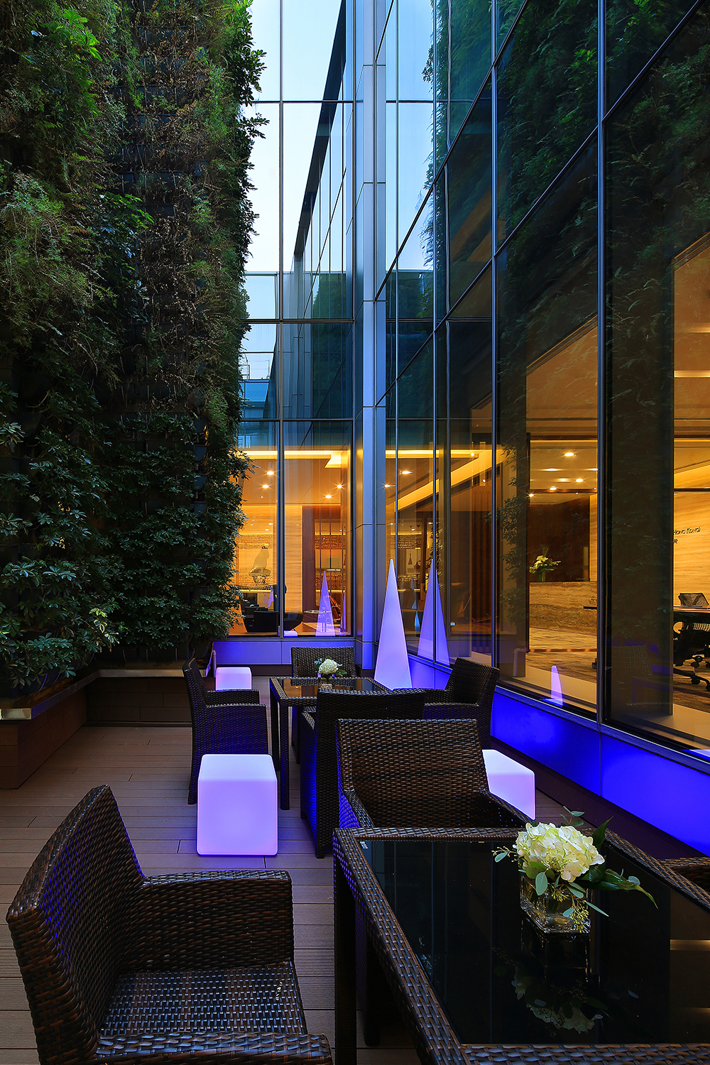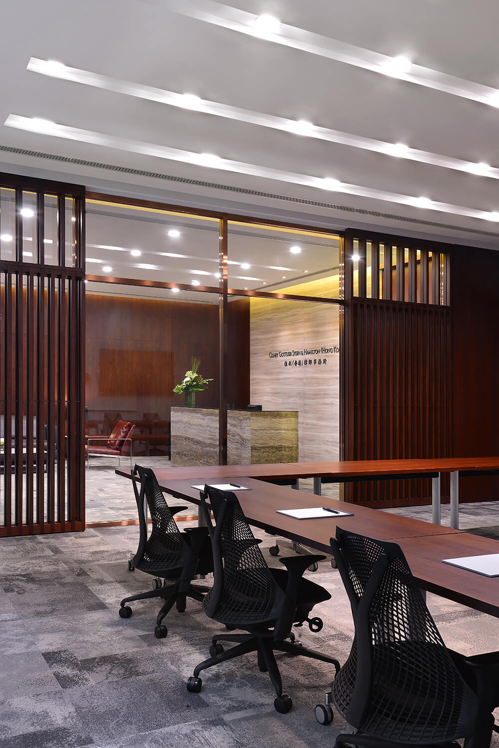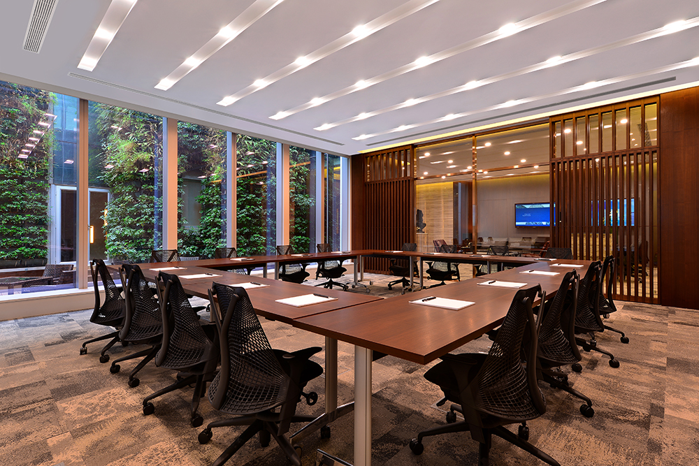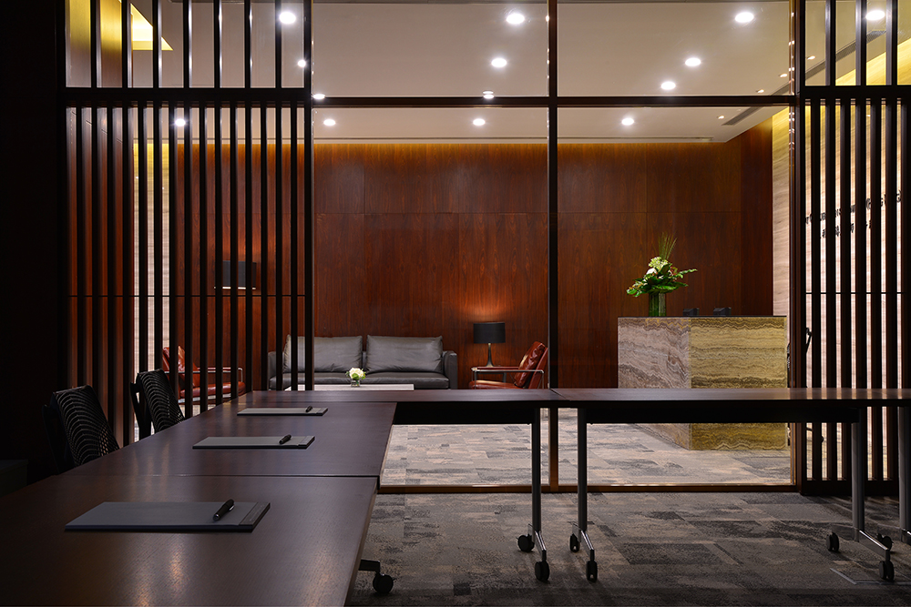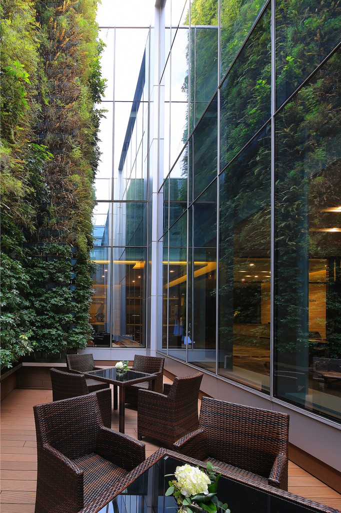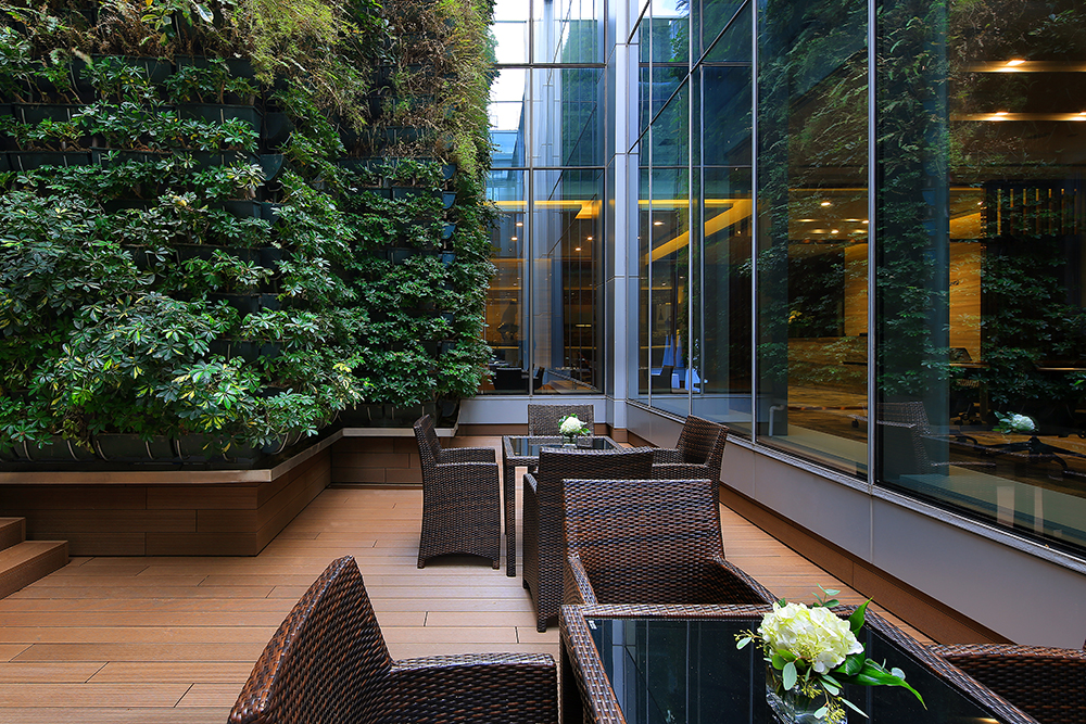 Without sacrificing the vibrancy in a formal utilitarian space, dialog between the exterior and interior were carefully maintained. The use of natural materials such as timber veneers and natural stones were initiatives to harmonize with the vertical green wall at the outdoor terrace. Three main spaces including the Reception area, Conference Room and Pantry Area were planned to surround the outdoor terrace to fully optimize the original architectural intention.
