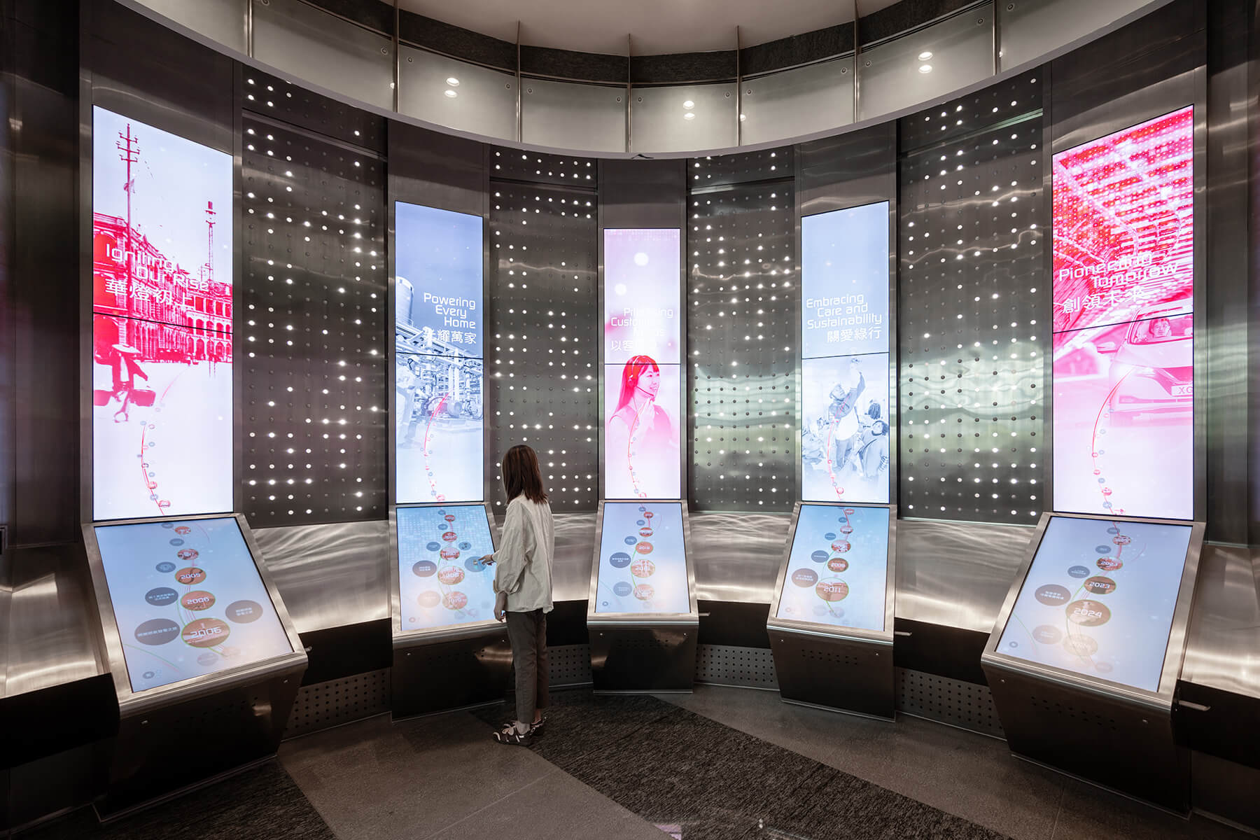 Throughout the space, programmed lighting is seamlessly embedded within the wall surfaces, creating a visual rhythm that echoes the theme of “tradition meets technology”. The exhibition not only represents HK Electric’s enduring role in illuminating the city but also demonstrates our expertise in creating sophisticated and immersive storytelling.