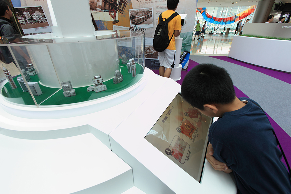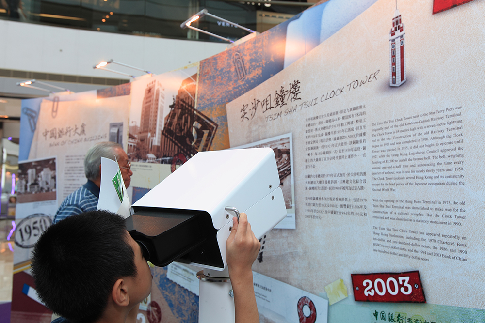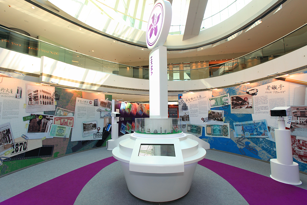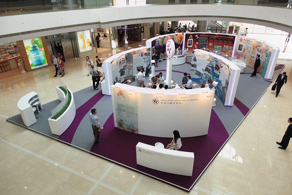 Images juxtaposing the old face and new look of iconic buildings ever featured in Hong Kong banknotes dominated the middle ring. At the innermost ring was the logo of Hong Kong Monetary Authority sitting atop a column made out of a light-box. The column was encircled by a glass showcase featuring paper crafts of local iconic buildings. The paper crafts were also offered to visitors as mementos of their visits.