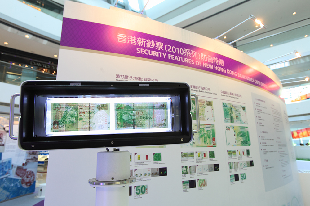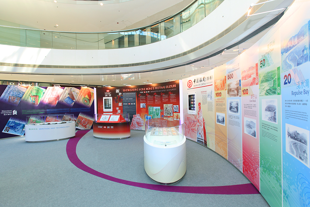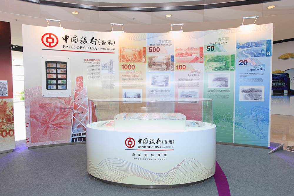 Designs and security features of the new series of Hong Kong banknotes issued by the three local note-issuing banks were shown on the outermost ring with each bank occupying one of the three curved walls.