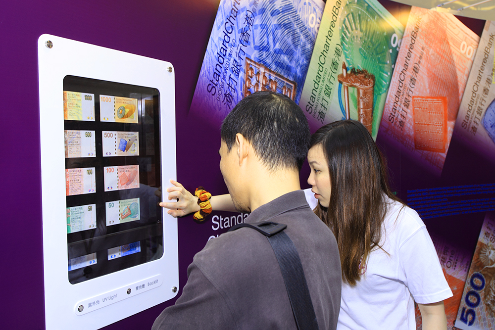 Specially-designed interactive features were on hand to educate the public on the eight security features of the new banknotes. For example, visitors could learn about individual security features of a banknote through button-activated text information displays on a large projected image of the banknote.