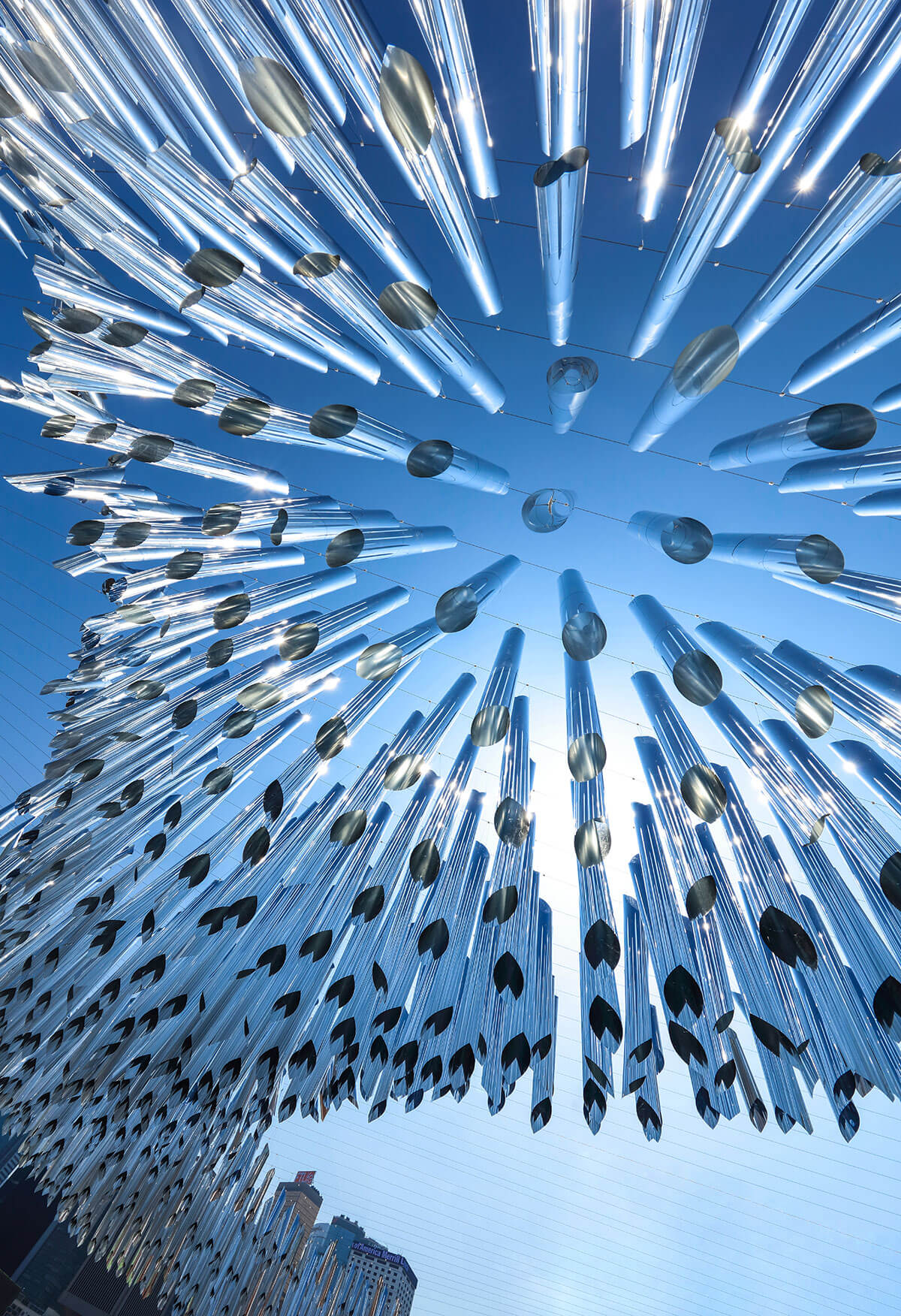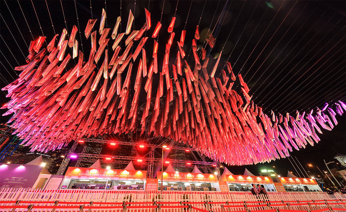 For large outdoor installations, complicated calculation and heavy duty structural works seems to be unavoidable to withstand strong wind and adverse weather. However, we decided to take a different approach this year. Instead of working to against the wind load, the design made clever use of the wind to create special wavy effects. A 20m square grid made of tension steel wire was mounted on the ceiling at a height of 8m, with more than 1,500 mirror finished plastic pipes of different lengths were hung onto the grid. When the wind blew, the pipes would rotate and sway with the wind. As the structure was light, wind load was reduced with the pipes’ swinging movements.